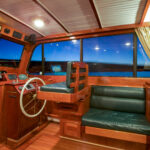 Jock noses the bow up to the dock, reverses the 260-hp Yanmar engine and brings the boat parallel to the dock. Jaime and I tie the boat off and help Jock get off. Jock has to get to his car. He has a doctor’s appointment. As we walk up the ramp, I spot a classic Stanley with a black hull and varnished topsides. I ask if it’s a 36 or a 38. “That’s a 36,” Jaime says.” That’s Jock’s boat, Hokulani.”