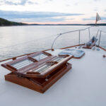 To show me how the boat performs, Jock gets behind Sea Shepherds’ wheel. He adjusts the custom-designed helm seat and takes me and the yard’s general manager Jaime Weir for a ride on Somes Sound. Jock shows me how the boat can turn in its own radius, how quiet the inboard is at full throttle, how the huge teak windshield was designed to keep the driver dry even when water is coming over the bow, and how the windshield’s height was calculated so the caprail, which got its profile from an old doorknob, wouldn’t obstruct the driver’s vision while standing.