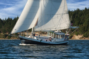 The relaunching caused some anxious moments for Morse. Over 8 years on land, the boat’s planks had dried out and the ketch took on copious amounts of water that required multiple pumps to keep her boot stripe from disappearing. Despite that, Nyboe reported a couple of days after launch that the boat was down to one pump and would be fine.