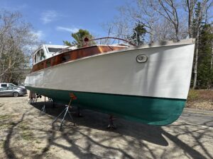 The 40-footer spent six months at Hoagland Marine in Walpole, Maine, where the boat’s new owner, Rick Morse, worked alongside carpenter Ben Hoagland for six months to ready her for the water. Among other improvements, most of the planks on her transom were replaced, as were some of her sheer strake planks and a few sections of the deck. The boat also received new pumps, new paint and new varnish.