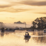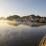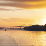 Sunrise over the Chesapeake City bridge from Snow Goose’s flybridge heading towards the Chesapeake Bay and Annapolis.