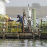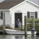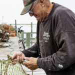 Freddy Wheatley, Tangier waterman mends crab pots on his dock while telling us his tales.