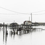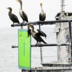 Pelicans and Cormorants waiting for a meal in the fish traps on the Chesapeake off of Smith Island, Virginia.
