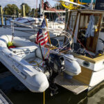 A good view of the stern of Snow Goose showing the Edson Davits, the North Atlantic rigid inflatable tender at the town marina in Onancock, VA.
