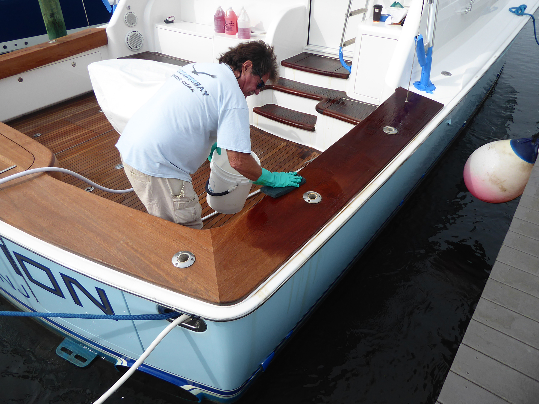 Acid-based teak cleaners do a wonderful job extracting dirt and other impurities from the wood, but precautions are necessary, as with any industrial-rated product. My teak cleaning drill is to focus on the wood, but also to be aware of the adjoining fiberglass, metal and painted surfaces. These acids can damage anodized aluminum, so I always generously wrap the metal with layers of tape. I also remove the teak treads from the flybridge ladder and treat them as a separate process, because rinse water will flood and spray everywhere. Similarly, throughout the process, I spray copious amounts of water down the hullsides and transom, and out the scuppers, to prevent streaks in the gelcoat or at the paint waterline.