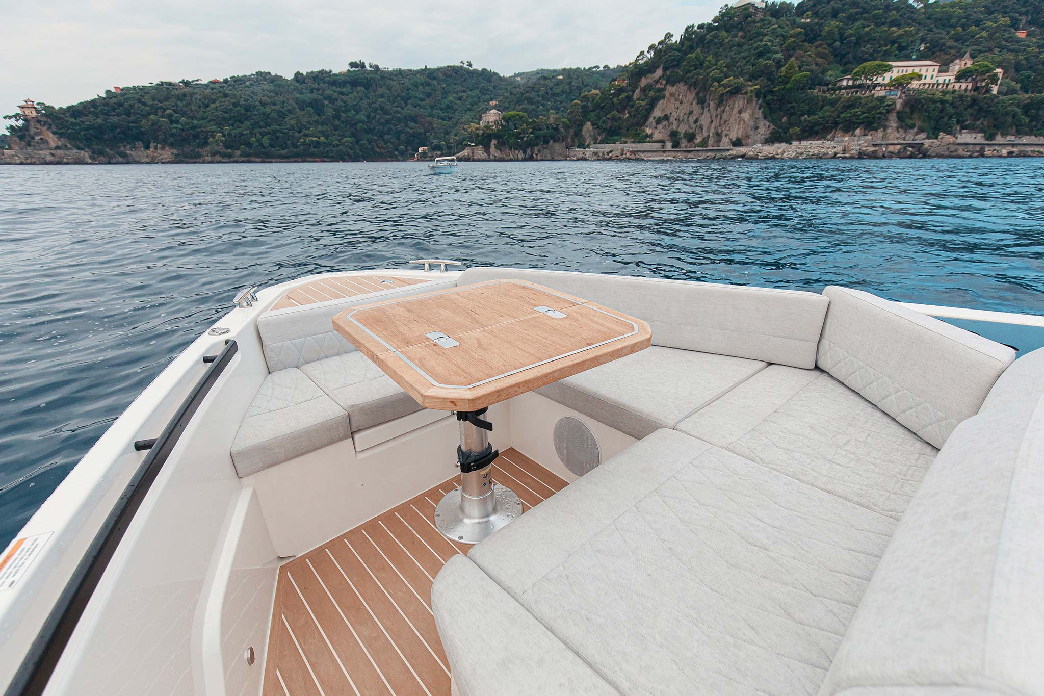 To board from a floating dock, step onto swim platforms that flank the outboards and walk through the gates that are part of a pretty glass and chrome transom. In the cockpit, there’s a grill and sink to port and an aft-facing bench that converts to a sunpad.