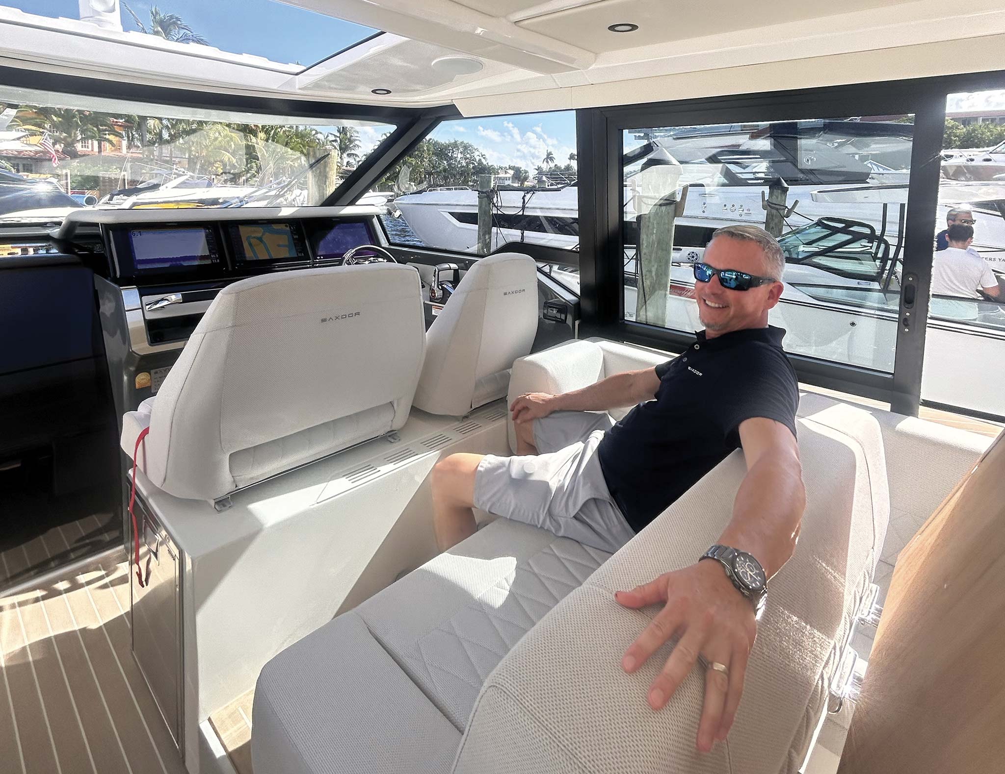 Just then, this Saxdor fan and I are joined by Keith Miller, vice president of North American sales for the builder. He’s here to walk us through the boat. He begins by demonstrating how quickly and easily the 400 GTC can shapeshift.