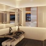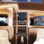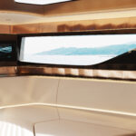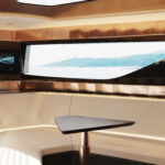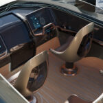 At the helm, the boat features ‘The Wingman,’ a fully integrated management system providing full control over the vessel, and egg-shaped helm seats for ergonomic support and comfort. The spaceship-like style of the Vatoz continues below deck to the main cabin where a skylight and large side windows provide natural light. For dining and entertaining the boat features a U-shaped seating area with a table, and a single head.