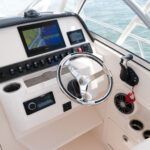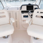 The beam also provides room for larger, more comfortable helm seats. On this boat, those seats—each with armrests and premium upholstery—swivel 180 degrees; that means the driver and copilot can face aft to monitor lines when trolling, or engage with guests when entertaining in the cockpit. At the dash, there’s space for Yamaha engine controls, a gauge package and a 12-inch multifunction display.