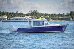 The Calypso 26 rides a deep-vee hull, and a single 350-hp Mercury Verado 4-stroke is standard. Twin 150- or 200-hp outboards are optional. “With the standard 350 engine, the boat will run north of 50 mph,” says Chris-Craft chairman Stephen Julius.