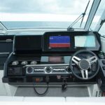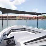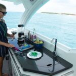 To port of the helm is the entrance to the cabin, which accommodates four guests overnight. “This is more of a dayboat, but when the weather turns and you’d rather not head back home, the family can sleep here,” Adams said. There’s a double berth, a convertible U-shape lounge, a head with a shower, and a galley.