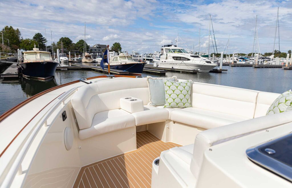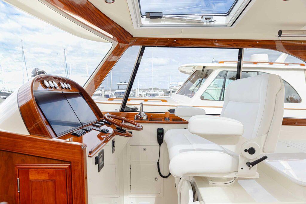 The waterjets are controlled by JetStick 4, the latest version of the builder’s joystick system. “It’s intuitive,” says Bryant, who was at the helm of the 39 as we prepared to leave our slip at Bay Bridge Marina in Stevensville, Maryland, which Hinckley acquired in 2025 to expand its service network on the Chesapeake Bay.