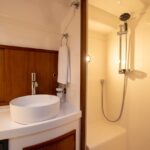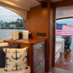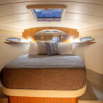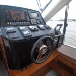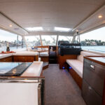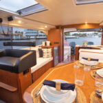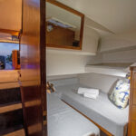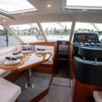 The M47 galley has two pull-out refrigerator units, a top-loading freezer, and a four-burner propane range with an oven and broiler. An aft galley window can be opened and secured for owners who want to feel the wind while they’re underway. The salon has a large L-shaped settee and teak table that can be converted to a berth. The M47 has a queen-sized master berth forward, amidship guest cabin and a single head.