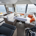 The Absolute 52 Fly’s helm station has ergonomic seats plus settees for passengers. The cockpit terrace’s modular furniture can be rearranged and includes adjustable shades. The saloon has 360-degree views and air conditioning but can be naturally ventilated by lowering the electrically-controlled windows and features a galley and wet bar.