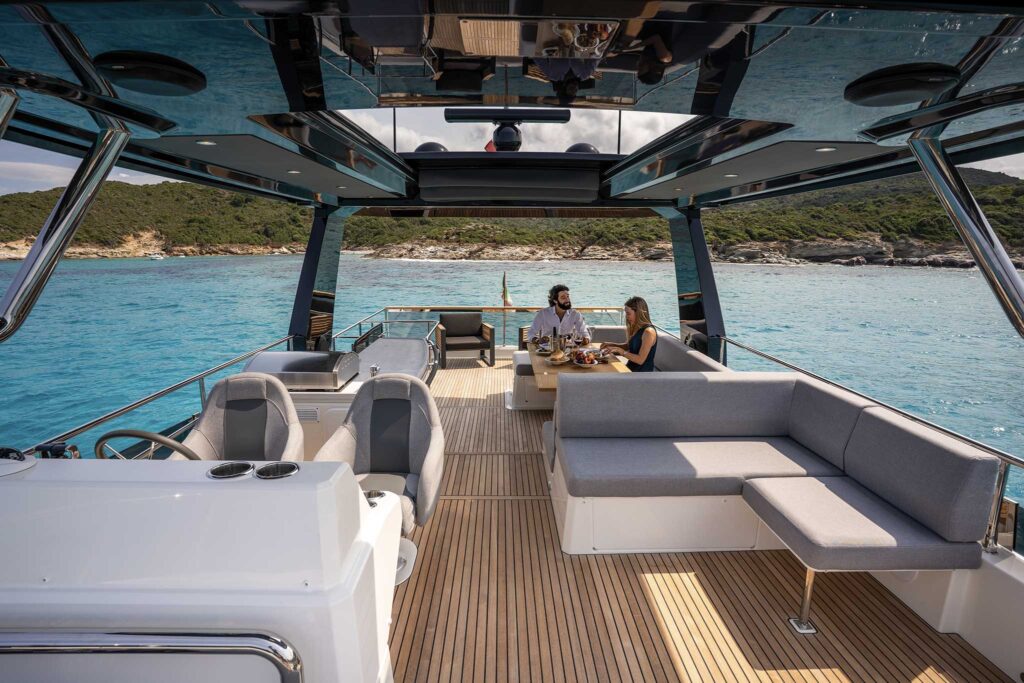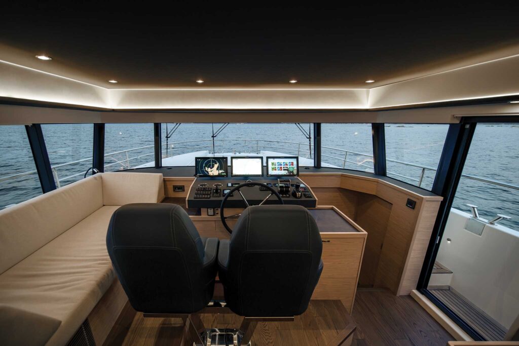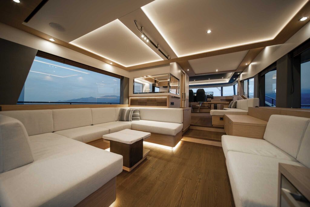 As a high-volume yard, the French boatbuilding group’s processes are rigorous, to say the least. Designers create interiors that are quick and easy to build, and when it comes to fiberglass work, they are required on every new model to achieve a 40 percent molding commonality with existing projects. So when you find yourself wondering if you’ve seen that galley cabinet or flybridge seat somewhere before, you probably have.