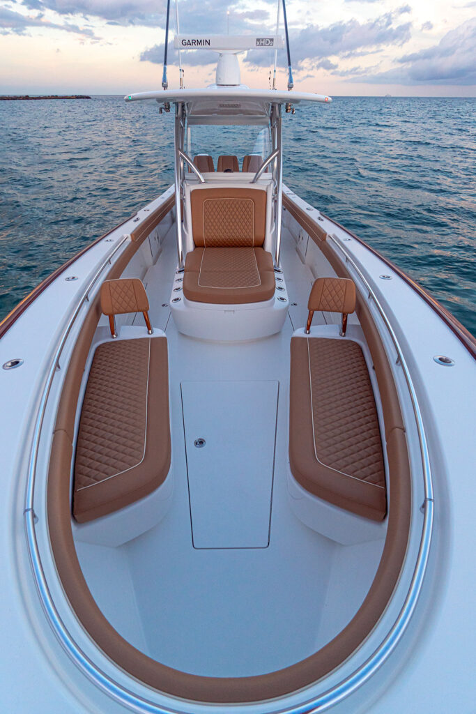On their wish list, a top consideration was a seating arrangement that would suit the whole family. Frank also wanted a joystick at the helm, upgraded electronics including Starlink and night-vision cameras, and outriggers. Triple 400-hp Mercury engines were also on the list, because of performance he’d seen from those engines on other boats.