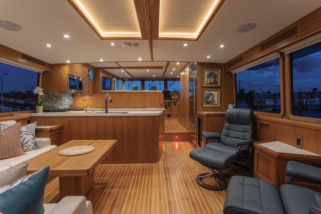 Other key features are a Kevlar-reinforced collision bulkhead, an island-friendly draft of 5-feet 8-inches, an optional crew cabin, hinged radar arch to ease navigation under bridges, wing stations on the bridge and Dockmate for easier tie-ups. There’s also a second helm station on the entertainment-friendly bridge, which West seems to like. The helm in the pilothouse is a great place to navigate from, but as West points out, “why drive from the living room if you don’t have to?”