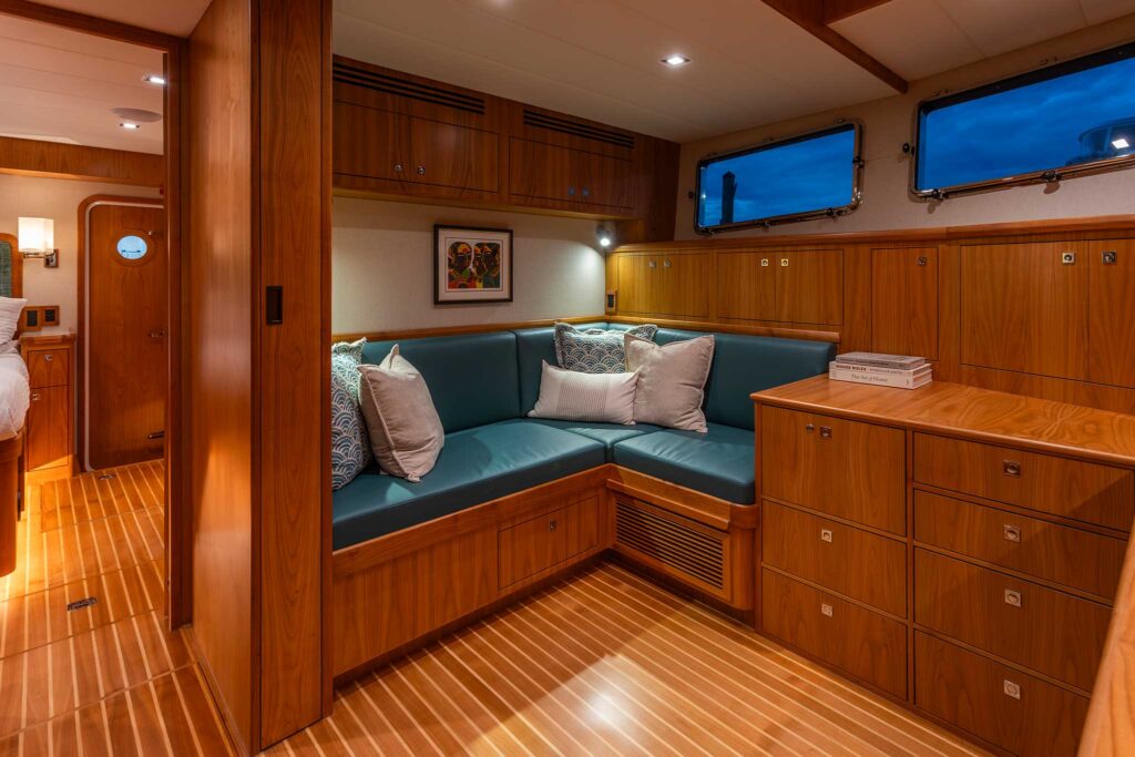 Among those were ideas for the office. The 60 Open has multiple floor plan options on the accommodations level, anywhere from 2 to 4 private cabins. Sonal and Hement went with a full-beam master stateroom amidships, a guest cabin forward and an office between them on the port side of the boat. A built-in desk, plenty of drawer and shelf stowage, plus an L-shape settee make for a functional and comfortable area. To maximize the available space, Kadey-Krogen suggested a sliding cherry wood pocket door that looks as good as it operates.