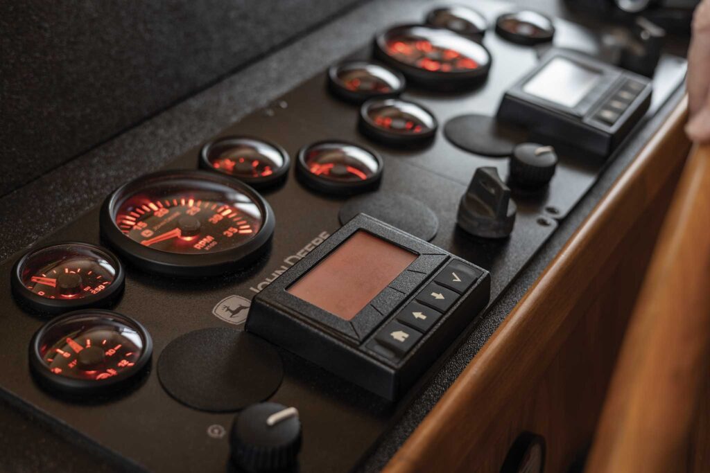 “This is the largest boat built by Kadey-Krogen in its 50 years in business, and we’re very proud of hull number one,” says Tucker West, president and CEO of Kadey-Krogen Group. West and his team launched the boat publicly at the Palm Beach International Boat Show in the spring, where it generated a lot of enthusiasm from long-distance boaters. Highlights on this build, according to West’s list, include a pair of 200-hp John Deere diesels and 1,800 gallons of fuel that can push the boat to a range of 4,005 nautical miles at 7 knots with a 10 percent reserve. Propulsion is housed in one of the largest engine rooms on a boat in this size range; it has 8 feet of headroom and plenty of beam to make machinery access easy.