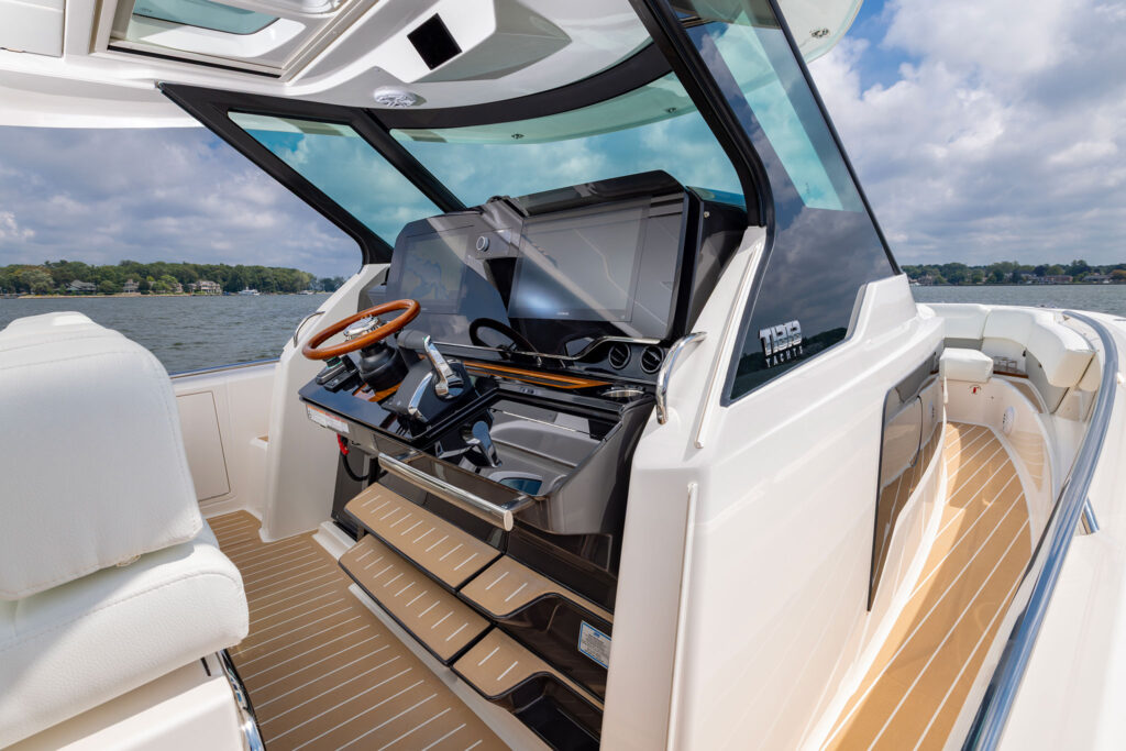 Peering aft, I couldn’t help but think that the placement of the entertainment-station module helped to buffer the already-faint thrum of the power plants. At anchor, a portside terrace door folds down to broaden the cockpit with an even wider beam. (The starboard side of the cockpit has a dive door). I was able to sit perched above the water on the folded-down gunwale, where I marveled that this boat with all this space for relaxation is shy of 40 feet in length.