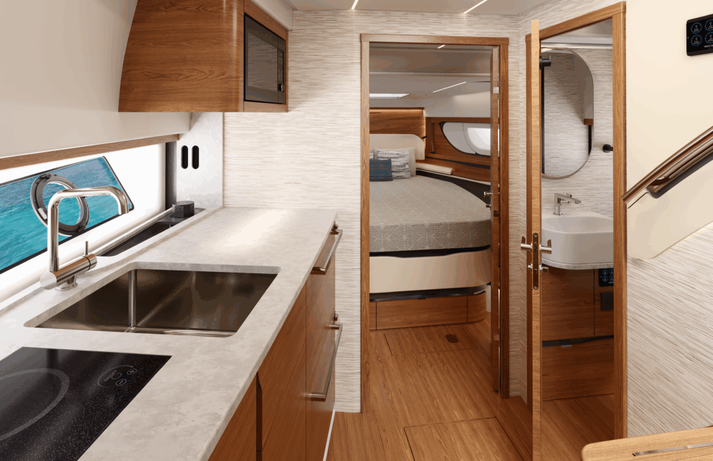 There are multiple social zones aboard, including the bridge deck, where the helm and companion seats rotate to form an L-shaped lounge. In the cockpit, the layout can be customized for an owner’s preference. For instance, you can order the “buffet lounge module” (shown below), which is a rotating lounge that locks in place at multiple positions and has built-in features for food prep and service. It’s a good feature for entertaining. For those who prefer water sports and fishing, there’s the adventure module that has everything from a sink, cutting board, freezer tank, live well and rod holders to a fold-down seat and fresh-water washdown.