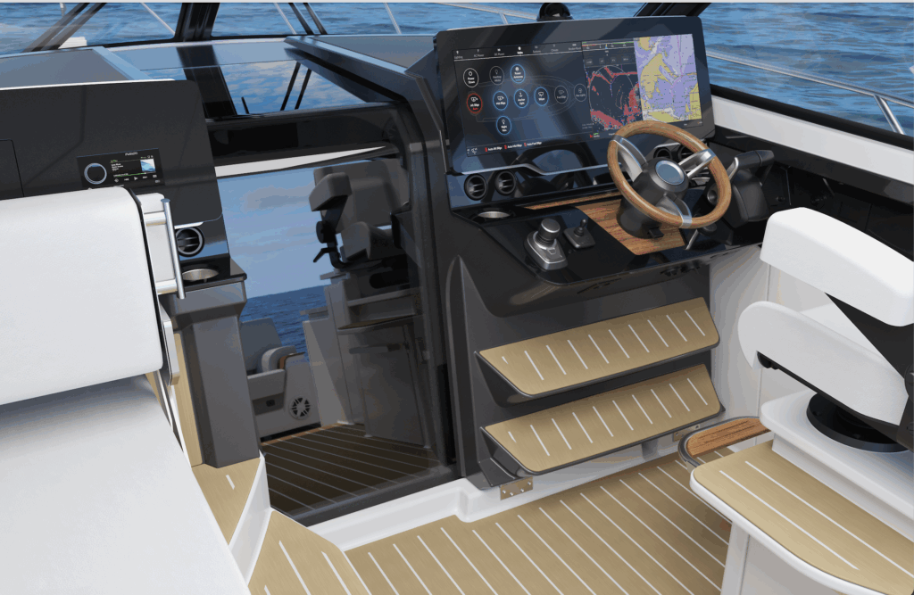 The 39 LE has a length overall of 39 feet, 6 inches, and a beam of 12 feet 6 inches. It’s powered by two Mercury 600-hp V12 Verado outboards and features joystick piloting. Garmin Marine navigation systems are at the helm, including the 9219 touch-screen display that integrates with EmpirBus digital switching.