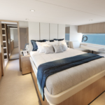 The 58 SMY can sleep seven guests and one crew member on the accommodations deck. The accommodations deck houses three staterooms and three heads, as well as the full-beam owner’s stateroom with a private head. Aft of the owner’s cabin is a utility room or crew cabin, depending on the owner’s choice. The owner’s cabin features lots of overhead deck hatches and hull windows.