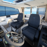 At the helm a curved, tempered glass windscreen provides wide sightlines. If the weather is pleasant, owners can open an electric sunroof and sliding side windows to enjoy the breeze.
