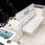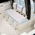 The 11-foot, 4-inch beam provides oodles of room inside the gunwales for fishing and family fun. Forward is an elevated, U-shaped social zone with twin forward-facing chaise lounges, bolstered backrests around its rim and a two-person chaise. A drop-in table completes the area. Alternatively, the cushions can be removed and the tabletop dropped to create a casting platform.