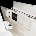 Anglers will appreciate several standard fishing features. These include twin 100-gallon in-deck fish boxes; rod holders from stem to stern; twin 30-gallon livewells; two diver doors on each side of the cockpit; standard electric reel power outlets; and a 65-quart YETI cooler. A Simrad electronics package with twin 16-inch multifunction displays, radar, autopilot, sonar and VHF radio also is standard.