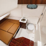 In the cockpit is an aft-facing, three-person bench behind a bank of three bolstered helm chairs, all covered by a standard fiberglass hardtop. A drop-down transom bench seats three. Adding to the R360’s comfort is a mini-cabin under the console with a sink, head, flip-up bench seat and a modest, upholstered berth.