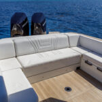 The new luxury performance day boat features twin 500-hp Mercury Racing engines that provide a cruising speed of 50 knots and a top speed of 80 knots. Owners can also opt for an inboard engine setup with twin 500-hp sterndrives. Fuel capacity is 211 gallons.