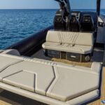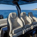 Beneath the carbon hardtop with its large integrated windshield, the helm has dual 12-inch multifunction displays and features three seats. An alternate configuration includes an additional row of three bucket seats.