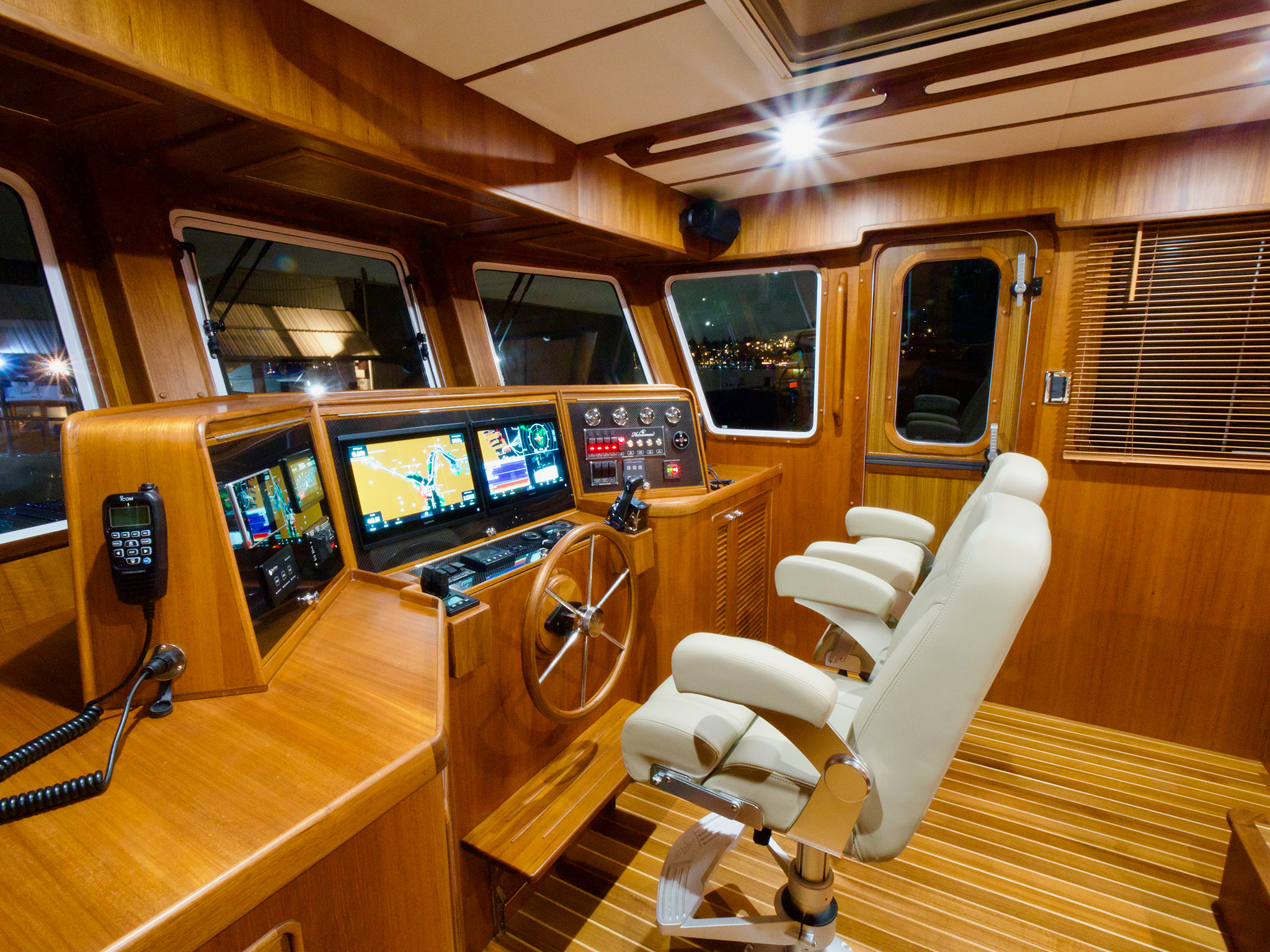 The owners also like the boat’s split head in the master stateroom; there’s a shower on one side and toilet on the other, for privacy. And they are fans of the customized electronics layout in the pilothouse, where redundant systems include two chartplotters, three VHF radios, Starlink and AIS.