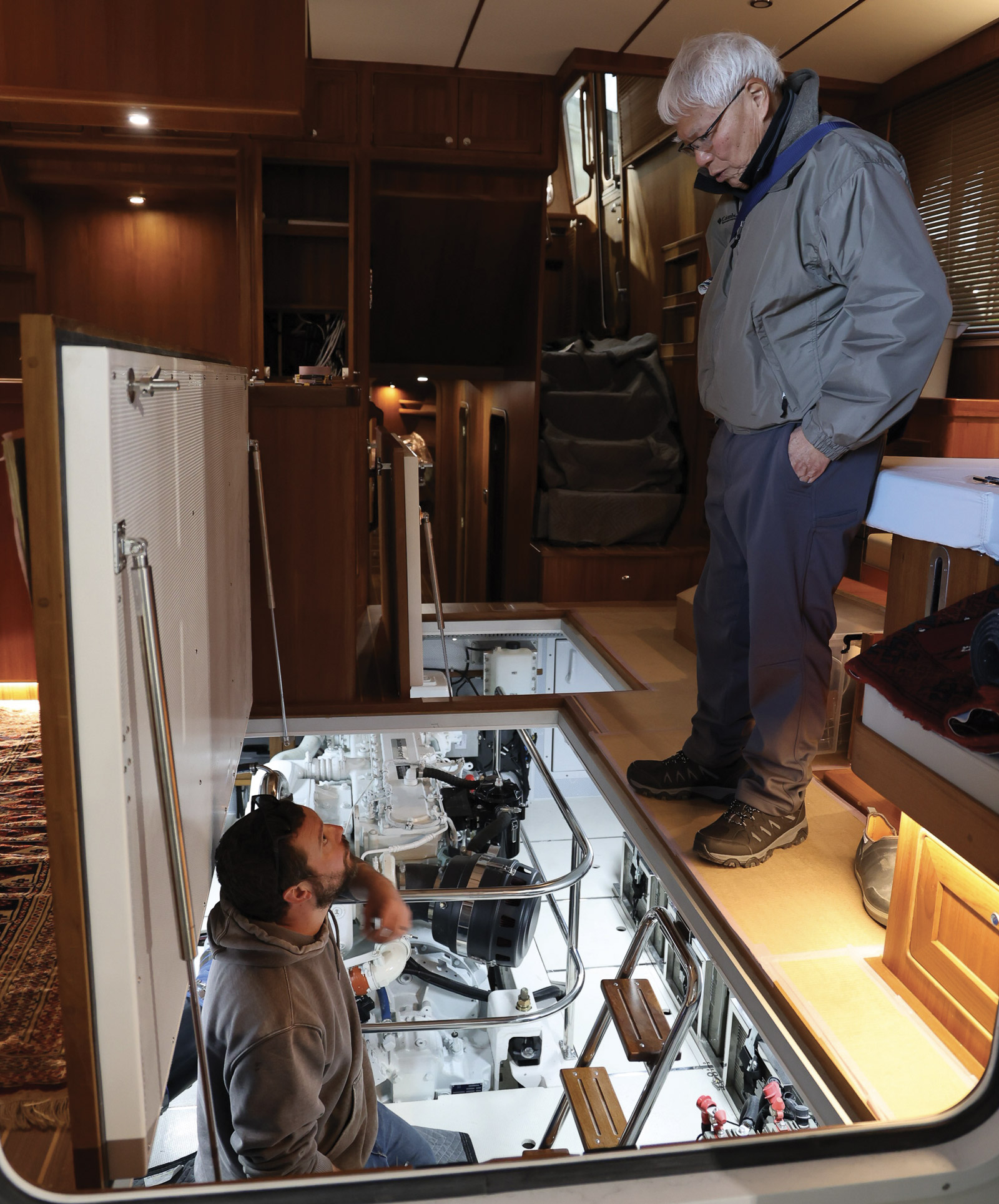 Robert didn’t agree. In addition to the stowage issue, the engine compartment under the salon was tight after a watermaker was added alongside the genset and engine. He loved his 38E, especially the beam-to-beam salon, but he just wanted a bit more boat.