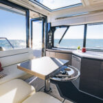 The wheelhouse can be opened to the aft cockpit by releasing the top-hinged window and entrance door. The front cabin has a full-sized bed and ensuite bathroom with separate shower. The 355 can sleep up to four people.