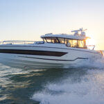Wellcraft, a 60-year-old American brand that has been part of the Beneteau Group since 2014, teamed up with American naval architect, Michael Peters, yacht designer Pawel Denert and interior designer Camillo Garronni to create a “fast, sea-worthy American outboard commuter for every sea condition.” With triple Mercury or Yamaha engines providing up to 1,050 horsepower, the Wellcraft 355 is advertised with a top speed of over 50 knots.