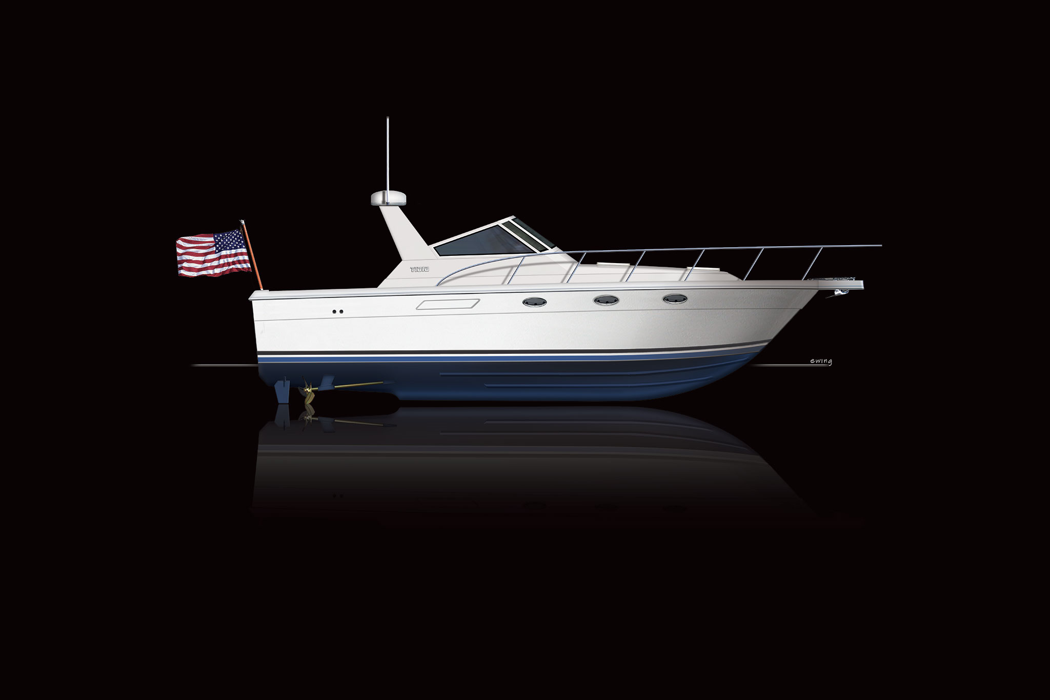 With a Ray Hunt hull and Ted Hood overseeing construction, this semi-custom powerboat floated the dreams of many anglers. Illustration by Jim Ewing