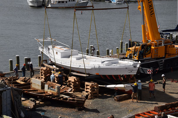 Watch as Chesapeake Bay Maritime Museum shipwrights crane the topsides and deck of the 128-year-old bugeye Edna E. Lockwood atop her newly constructed log bottom. WATCH.
