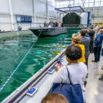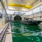 3Dirigo was then taken to the Alfond W2 Ocean Engineering Laboratory, which UMaine unveiled in 2015 as a place to let companies test designs for offshore wind turbines, underwater turbines and ships. It has a high-performance wind machine over a multidirectional wave basin. “We put it in the wave basin, and it floated,” Dagher says. “We had eight people on the boat at one point, running the waves and the winds. There’s a lot more to learn, but it floated.”