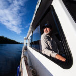 Family friend Michael Humphreys handles the bow while locking through on the Erie Canal. Rik can handle the boat alone, but having friends along on trips helps keep things social for Anne. Besides the master cabin on the main level, the boat has a double cabin in the stern of the starboard hull and a single up forward for Anne’s aide.