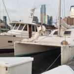 After the Luau 35’s gas outboards broke down on Long Island Sound, Rik recruited friends and family and used the 1989 Transworld 50 fantail he and his oldest daughter jointly owned to tow the cat up the Hudson River to Albany, New York.