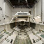 The location of the head, abaft the lower helm, was also problematic: It would block the helmsman’s rear view. Instead, Cooley explored the use of a “smart glass” bulkhead. It’s transparent when the head isn’t in use, and it becomes opaque with the flip of a switch. Another interesting feature will be the curved windshield, produced in partnership with Burke Design and ProCurve Glass Design. “It will be three pieces of glass, but will have the appearance of a single wraparound piece of glass,” Cooley says. “The idea is to have a sleek, modern look on a classic boat.”