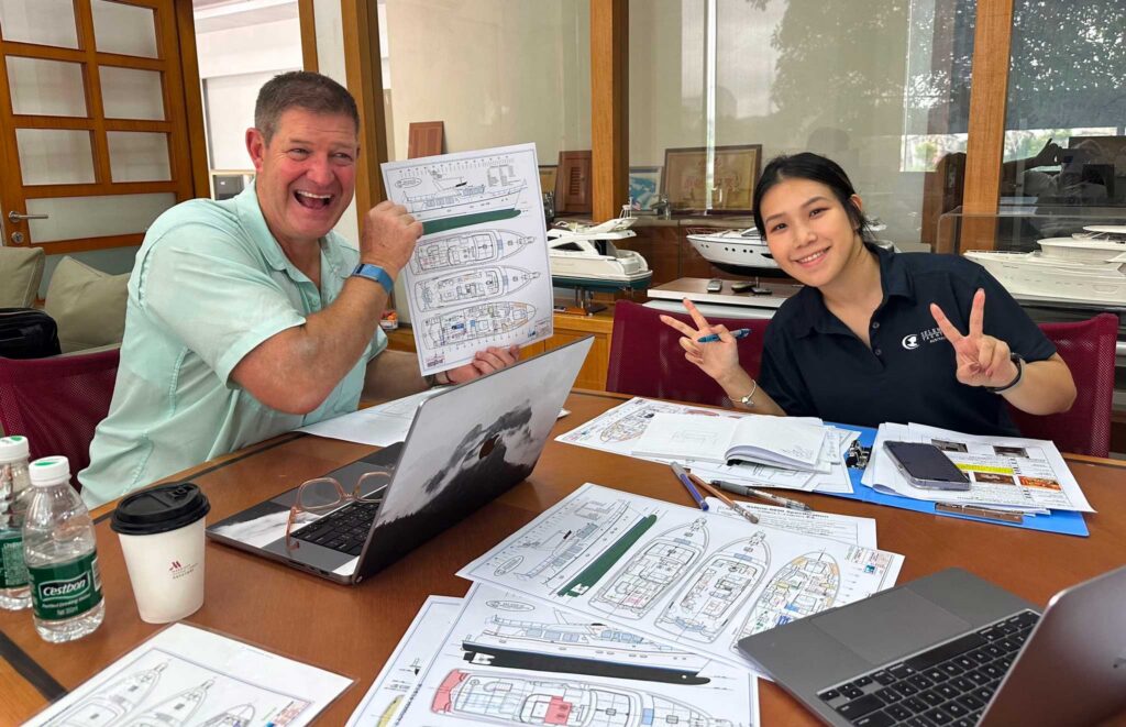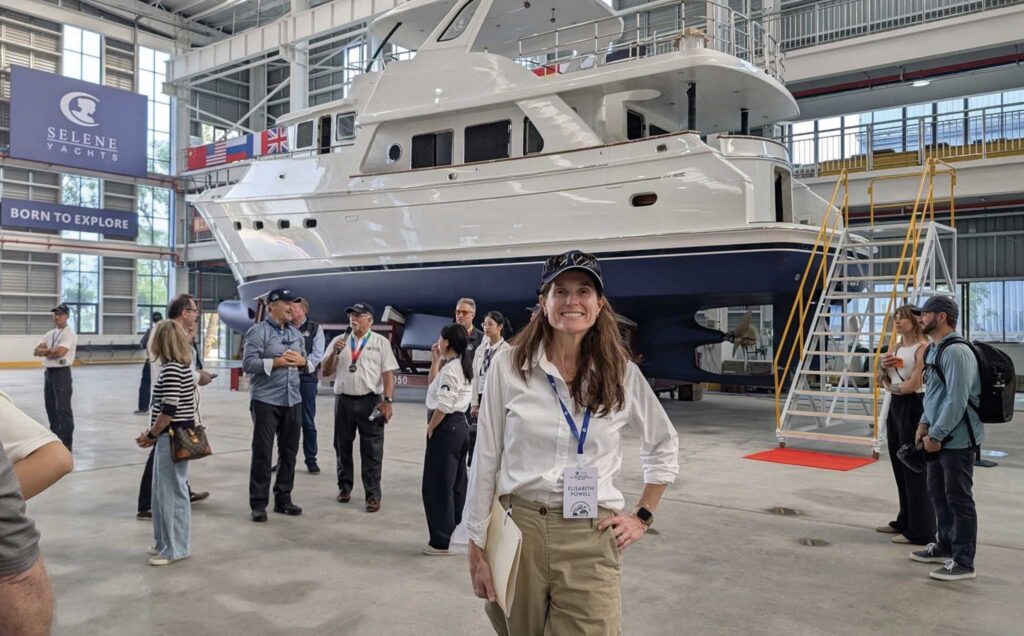 Since that first sketch, we’ve done factory visits to China. We met with amazing craftspeople and discussed features that have never before gone on a Selene 60. That includes the custom bathtub that Elisabeth dreamed of, and our cabinetry and ceilings built to my actual height. There’s nothing like walking through your own hull for the first time and realizing your vision is coming to fruition.