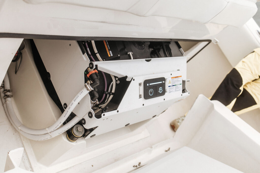 A pair of live wells were filled with pilchards as we ran out, triple 300-hp Suzuki outboards on the transom. The DG3 was installed forward, under the fiberglass module supporting the helm bench.