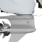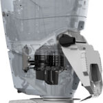 A multi-clutch, two-speed automated powershift transmission, designed by Mercury and manufactured in Italy by ZF Friedrichshafen AG, is located below the powerhead. First gear is 20 percent lower than second, which Reid explains delivers 20 percent more torque to the props. The ratio at the prop shaft in first gear is 2.95:1 and in second gear is 2.50:1, much lower ratios than the 1.75:1 gears in a