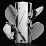 The props for the Verado 600 were developed by a team led by Roger Koepsel, master engineer with more than 50 years at Mercury Propellers. To maximize blade area, contra-rotating propellers feature four blades on the forward prop and three on the aft prop, as also seen on the MerCruiser Bravo III sterndrive. The front and rear prop shapes and diameters are also very different.
