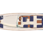 Other options include two day beds—one in the forward seating area and the other in the cockpit. The forward seating is served by a table that sinks flush to the floor, to become part of a daybed.