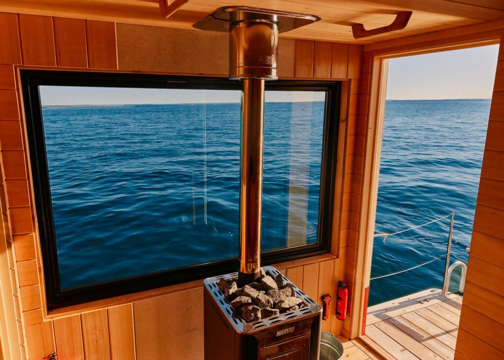 Inside the sauna, two bench seats, one higher than the other, face the stove and a large window overlooking the water. “That allows for this really wonderful experience, which is sitting in the sauna and gently rocking and having views out over the water,” Boldt says. Forward of the cabin is a sundeck with sling chairs and aluminum storage containers that double as bench seating, where passengers can spend time outside and jump in the water between sauna sessions.