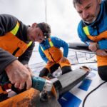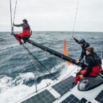 Onboard Team Malizia. Boris Herrmann, Will Harris and Rosalin Kuiper working on the outrigger.